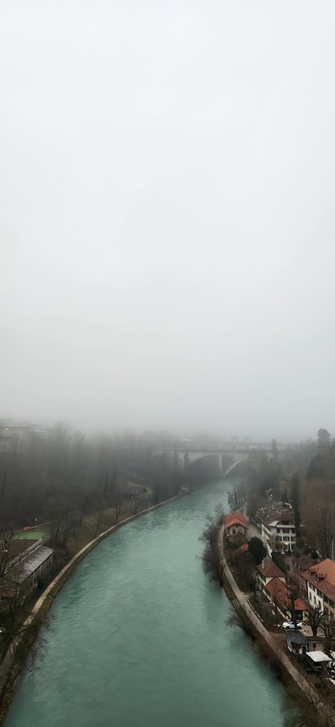 The highlight of this short trip was definitely when I made my way toward the river running through Bern. The foggy atmosphere that came with the cold, grey day was especially prevalent by the water. Like within the city, it was still strangely colourful despite the weather. In fact, I can’t remember every seeing water naturally the colour that the river was that morning. The water seemed lighter, more saturated, and less brown than a lot of rivers and lakes I’ve encountered before. Also, the bridge across the river was a great vantage point where I could see more of the city from a bit below. I wasn’t crammed within the dense buildings and could spot several steeples poking out over the terracotta roofs of the old city. Of course, I ended up heading towards these churches afterwards.