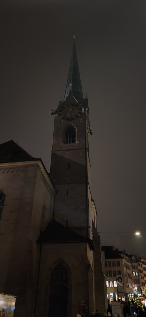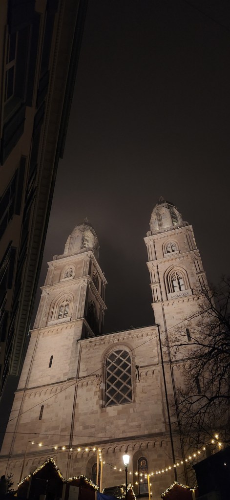 For anyone who’s been to Zürich, I hope you saw the Grossmünster. Because I, like always, had no knowledge of what I was getting into before visiting, I stumbled across this church by accident. It was only later in a text conversation with my father that I learned it’s one of the main historical attractions in the city, dating back to around 1100 when construction began. The full grandeur of the church didn’t hit me right while I was there (maybe because it was so dark out), but in hindsight, being so close to a building almost a millennium old is quite exciting. I think it’s one of, if not the oldest, churches I’ve seen. Most of the others, I believe, date back to around 1500, possibly 1400, so finding out the age of this church was surprising and exciting to me. Also, in looking back through my photos, pictures of this church make up the majority of my camera roll from Zürich, so clearly it stood out to me even in the dark.