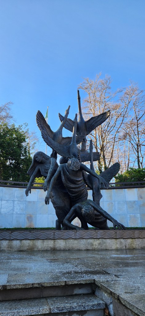After this, I made my way across the river, discovering other cool churches and museum buildings as I walked. I also walked past the Spire of Dublin, whose purpose I still don’t understand. I ate lunch in an area that I think was commemorating one of the world wars, but alas, I can’t read Irish, so I’m not sure. Regardless, there was a very cool statue in the area. Then, I walked towards the ocean. I ended up in a smaller area of Dublin, with a quite extensive beach. I had originally intended to walk across the beach, but it was much larger than it appeared. It must have been low tide, because Google Maps showed my little icon as being in the water as I walked. In the distance, I could see the silhouettes of houses and hills, creating a very beautiful view. On my way back into the city, I came across a stadium, more historic buildings, and some swans in a canal. It was a very nice little walk. I even stumbled across a home where Oscar Wilde apparently lived for a while.